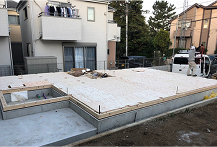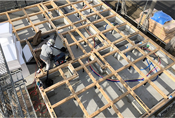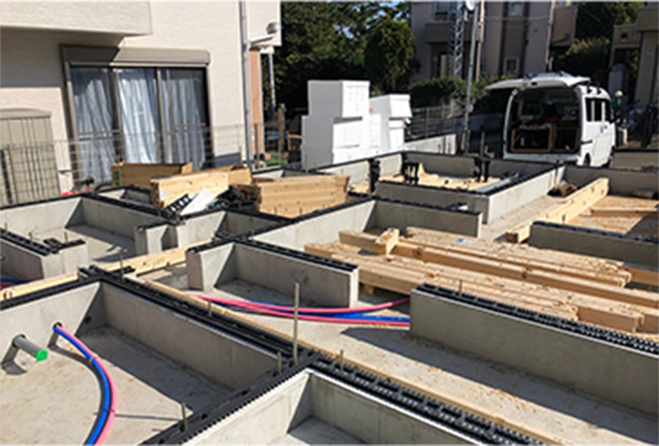 木造建築の骨組みの最下部にあたり、住宅の要になる部分です。基礎と土台の固定。規格に合った基礎パッキンを挟むことで十分な常設換気が取れ湿気などから家を守ります。床板の下には断熱材を敷きこむため冷気などを防ぎます。