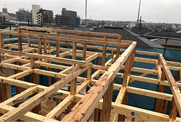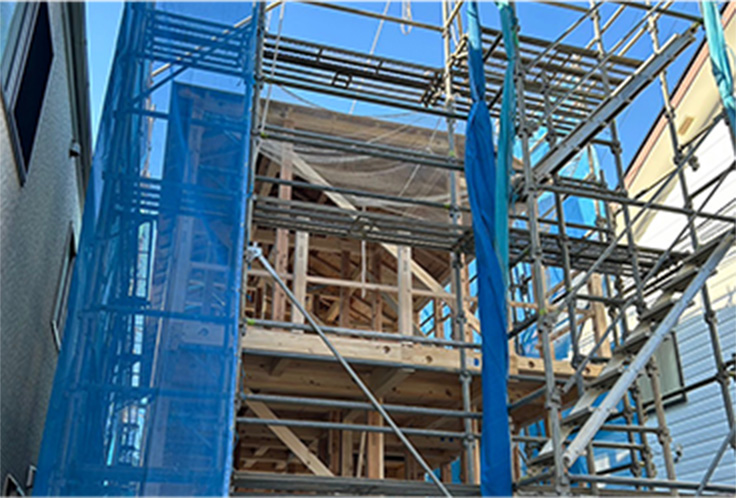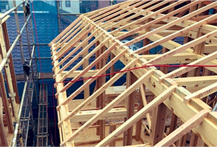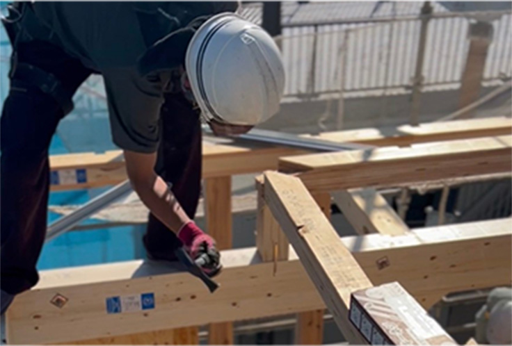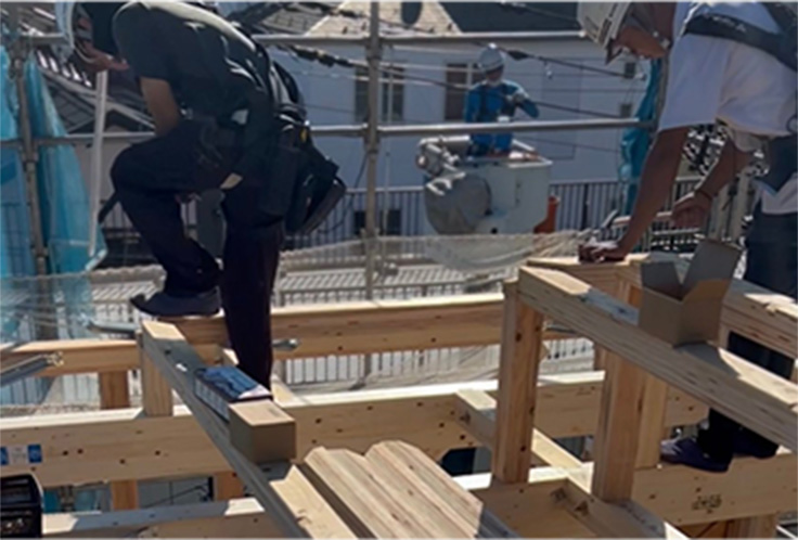 土台から上の骨組みにあたる部分です。多人数でチームを組み柱や梁などの材料から住宅の大本になる骨組みを行います。大雑把なイメージを持たれる事が多いですが精密な作業が求められる仕事になります。